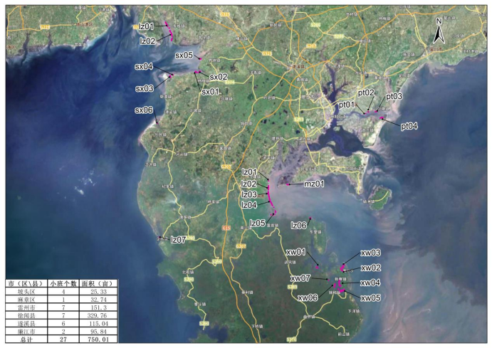 广东湛江红树林国际重要湿地互花米草消除和湿地退化区改善项目位于雷州半岛东、西海岸湛江红树林国际重要湿地范围内潮间带滩涂的互花米草分布区,涉及廉江、麻章(含东海岛)、遂溪、雷州、徐闻等区域,面积750亩。在互花米草分布区内实施刈割(基部残茬高度控制在5厘米以下)、围堰、进水节制、机械碾压、翻耕(刈割后,用机械翻挖互花米草残茬及根系,翻根深度要求达50-80厘米)、挖掘、覆膜(透光度不低于85%)等物理防治措施,消除互花米草。