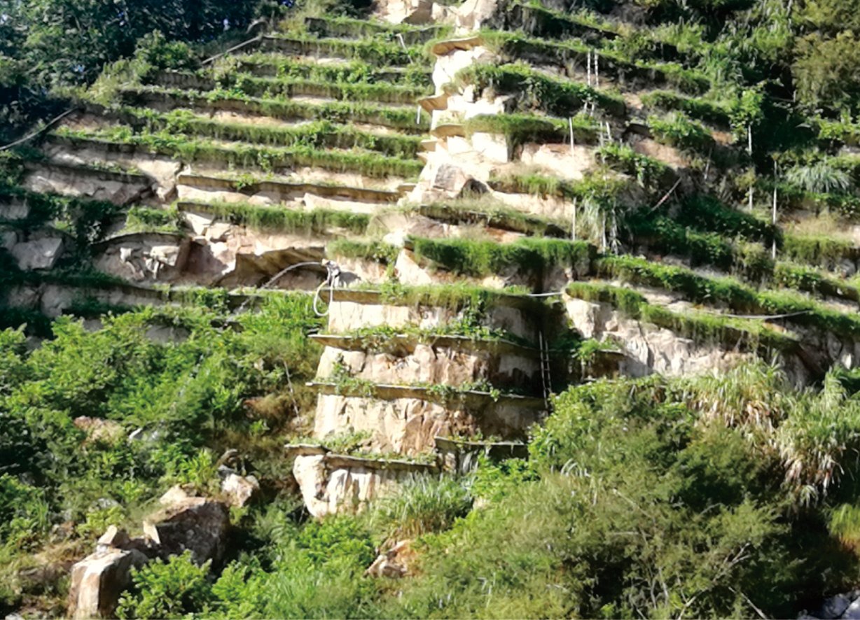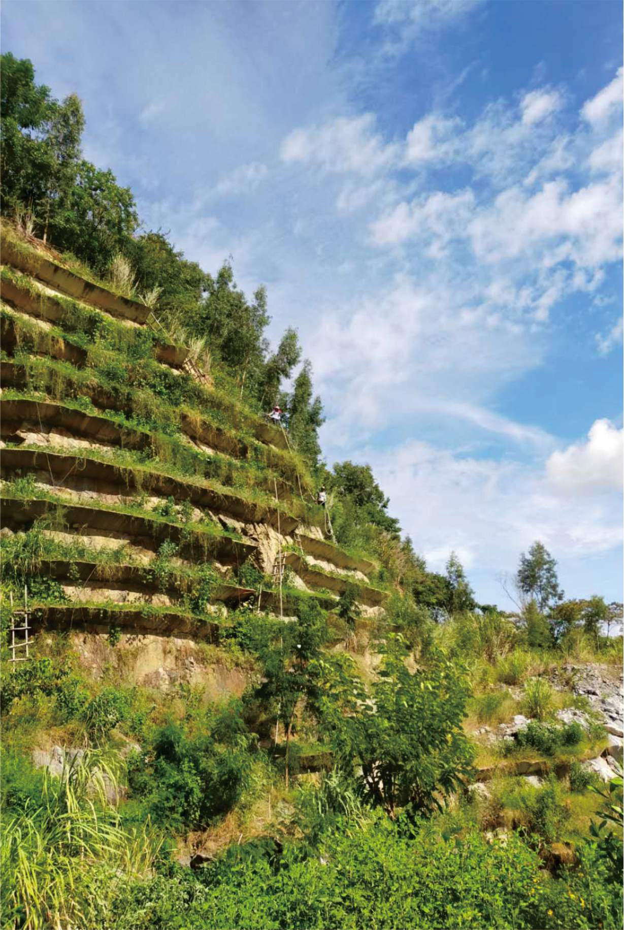 【项目介绍】南辰天意顺闭坑矿山总面积约16.94 亩,生态修复面积约为1.1 万平方米(裸露边坡面积)。通过边坡清危、锚固、设置灌溉系统,采用边坡加固技术、客土喷播技术、“V 型”槽技术、点挖筑穴技术、植物选择与种植技术、雨量传感自动定时遥控灌溉技术、三维可视化数据处理技术等技术对其进行绿色生态修复。