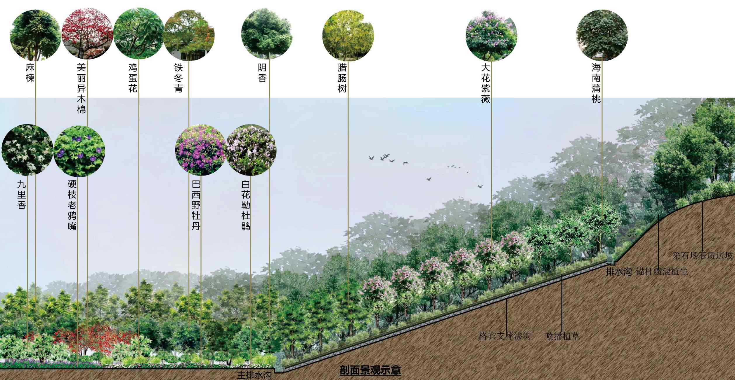 【项目介绍】该项目位于深圳光明新区柳溪工业园,广东深圳市光明新区红坳余泥渣土受纳场,原址为红坳采石场。该项目面积约15 万平米,三面环山,中间低,似盆式地形,外口处见岩,地形高差大,少植被覆盖,滑坡堆积体覆盖坡下场地,滑坡口及原受纳场内仍留有松散的滑坡堆积体和回填的城市弃土。本项目以恢复生态学理念为基本指导思想,对整个滑坡山体进行绿化复绿,通过水土保持、工程措施和生物措施创建先锋植物群落,最终实现与周边自然环境协调⼀致,形成可持续发展顶级群落。