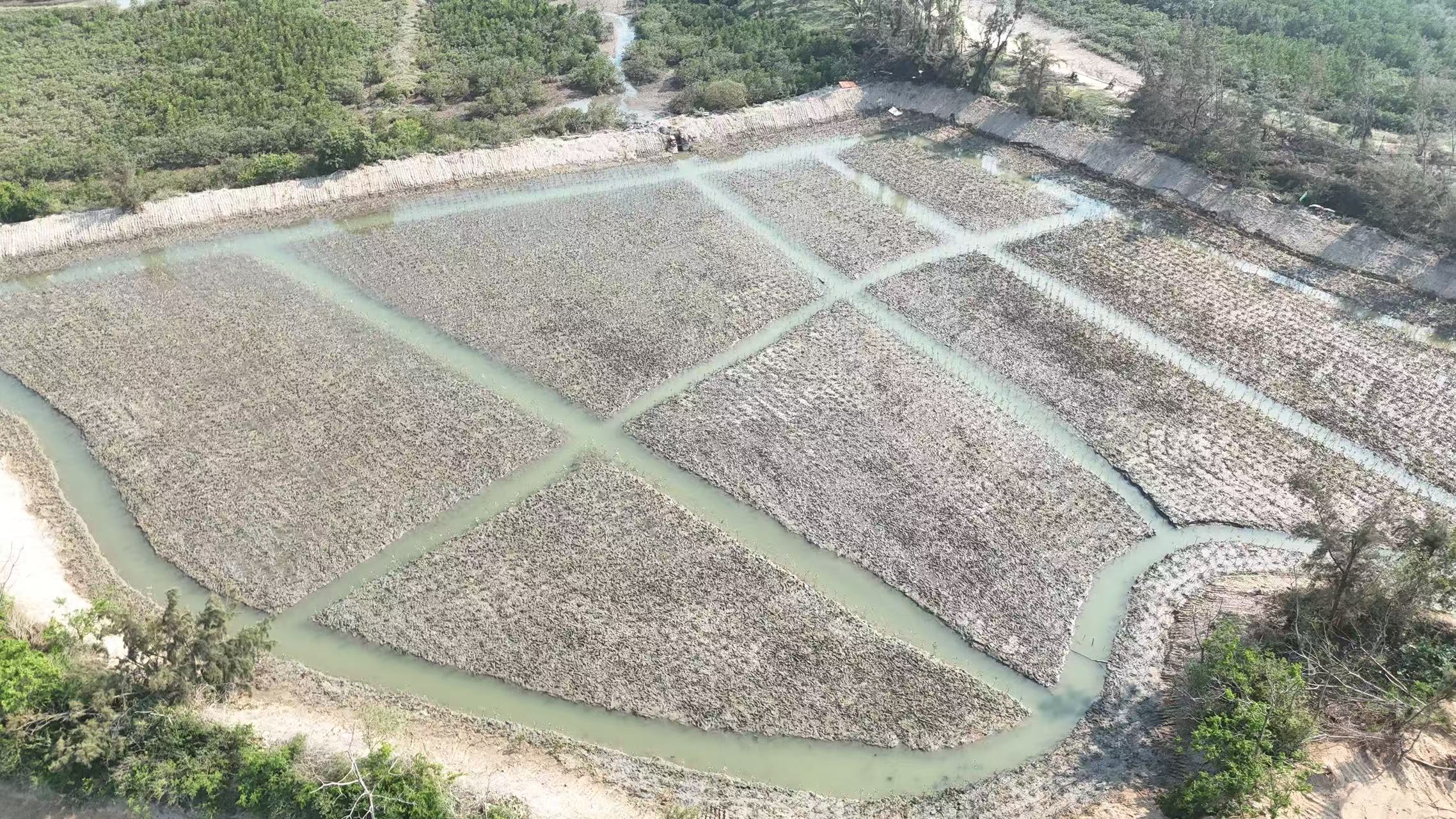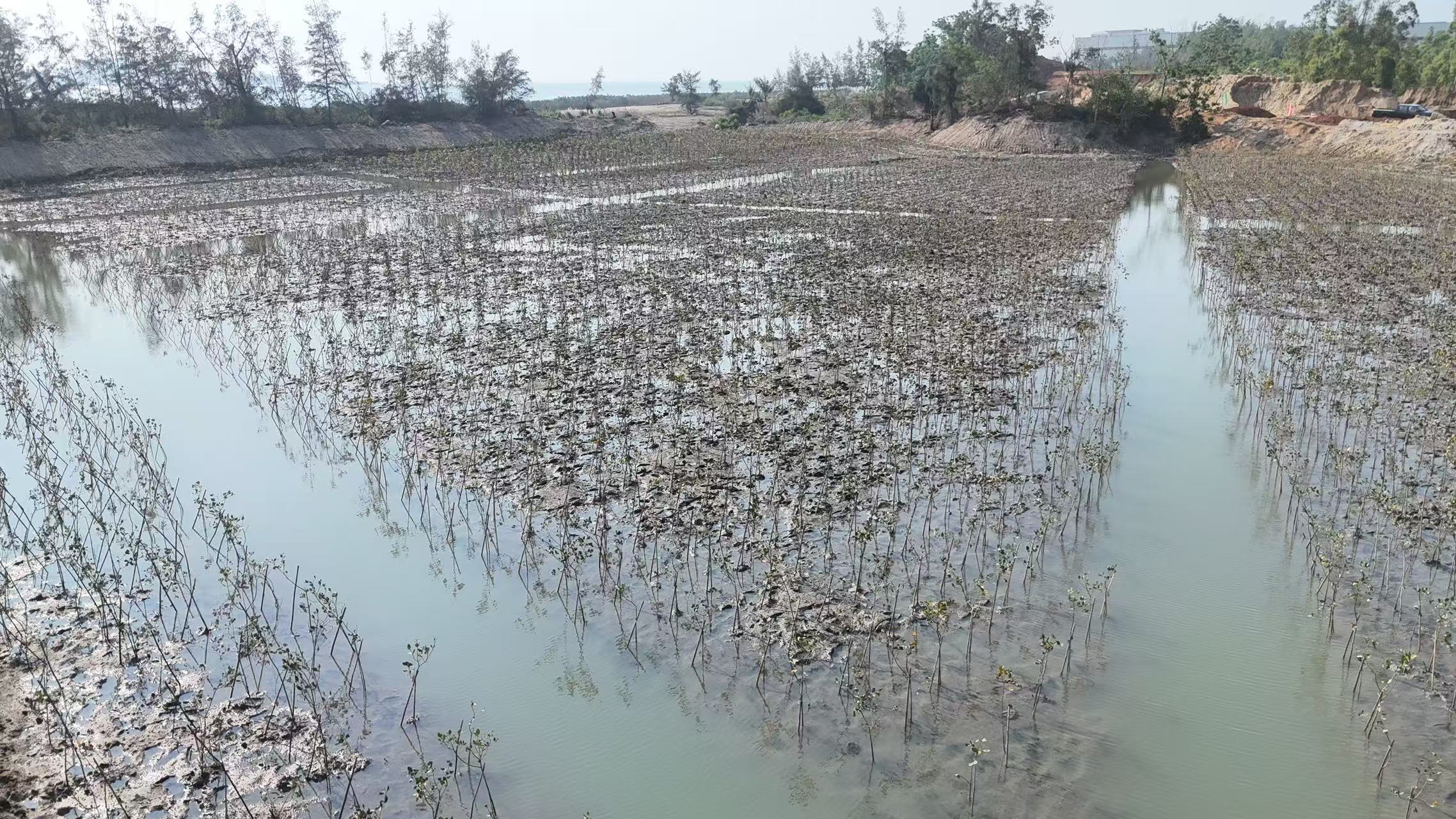 如春生态集团团队因地制宜优化技术方案:通过潮沟开挖构建水系网络,采用 “白骨壤 + 红海榄 + 榄李” 块状混交模式提升群落抗逆性,并配套围网防护、竹竿支撑等精细化管护措施,为红树林生长创造稳定生境。
